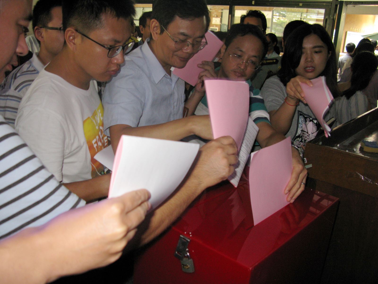 述职汇报完毕,与会教职工对学院领导班子及成员作打分评议,进行了无记名投票。