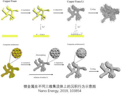 针对锂金属负极存在的上述问题,施志聪教授团队从三维集流体的表界面工程以及人工SEI膜构筑两个角度开展了一系列研究,主要包括:1)在商品化泡沫镍骨架表面均匀修饰准单层亲锂AuLi3位点抑制锂枝晶生长;2)在商品化泡沫铜骨架表面构筑双连续亚微米多孔铜结构抑制锂枝晶生长;3)在商品化泡沫铜骨架表面构建亚微米多孔铜锌合金与热偏析亲锂纳米锌位点协同抑制锂枝晶生长;4)海藻酸锂基人工固态电解质界面层用于稳定锂金属负极。基于以上改性策略,锂金属负极的电化学性能获得极大提升,具体研究结果详见下列相关论文链接:https://www.sciencedirect.com/science/article/pii/S2405829719300820?via%3Dihub