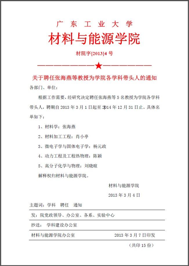 院字13年4号(关于聘任张海燕等教授为学院各学科带头人的通知)