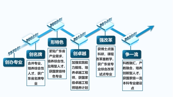 (2)层次攀升(2006-2014)。依托材料科学与工程一级学科博士点和材料加工工程二级学科博士点,形成了涵盖“本科-硕士-博士”完整的学历教育体系。2009年获国家和广东省特色专业建设点,2014年获广东省专业综合改革试点专业,专业办学质量和层次不断提升。